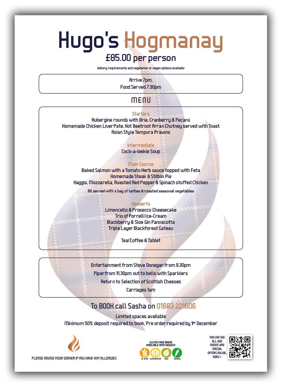 Why not join us for Hogmanay - To book call Sasha on 01683 221 606